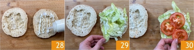 A ce stade, égouttez et séchez les légumes, après quoi vous êtes prêt à assembler votre kebab : coupez la pita en deux et tartinez un côté de sauce au yaourt 28, puis ajoutez la laitue 29 et les tomates 30.