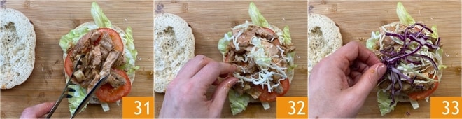 Continuez avec les lamelles de viande 31, le chou blanc 32 et le chou rouge 33.
