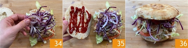 Complétez avec l'oignon rouge 34, puis fermez avec l'autre moitié du pain tartinée de ketchup 35. Procédez de la même manière pour assembler tous les autres sandwiches. Votre kebab maison est prêt à être dégusté 36 !
