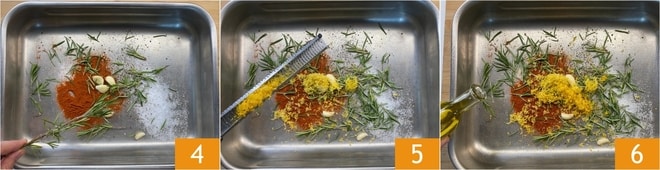 Ajoutez les aiguilles de romarin 4, le zeste de citron râpé 5 et l'huile 6.