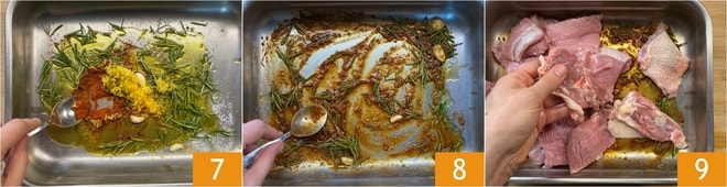 Ajoutez également le cumin et la coriandre en poudre 7, puis mélangez le tout 8 et déposez à l'intérieur les tranches de poulet et de veau 9.
