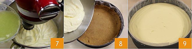 Enfin, ajoutez petit à petit au mélange le jus de citron vert et mélangez les ingrédients jusqu'à obtenir une pâte homogène 7. Maintenant, votre crème est prête. Sortez du réfrigérateur la base de biscuits compactée et versez la crème dans le moule 8. Assurez-vous de bien couvrir uniformément la base, en vous aidant d'une spatule pour égaliser la surface. Placez ensuite le gâteau au four et faites cuire pendant 60 minutes dans un four statique préchauffé à 170°. Pour la cuisson dans un four ventilé, faites cuire la cheesecake pendant 35-40 minutes à 150° 9.