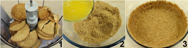 Pour préparer la key lime pie, commencez par placer les biscuits dans un mixeur 1 et mixez-les finement avec ses lames, puis transférez-les dans un bol où vous ajouterez le sucre en poudre (ou de canne si vous préférez); mélangez et ajoutez le beurre fondu 2, puis amalgamez bien les ingrédients. Tapissez, avec le mélange, les bords et le fond d'un moule à bords évasés d'un diamètre de 20 cm 3. Aidez-vous, pour réaliser cette opération, en pressant avec les mains ou avec le dos d'une cuillère. Mettez le moule au four à 180° pendant environ 10 minutes, puis sortez-le et laissez-le refroidir complètement sur une grille.