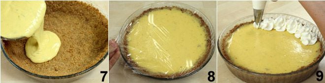 Versez la crème obtenue dans le moule tapissé avec le mélange de biscuits émiettés (déjà froid) 7 et enfournez à 180° pendant 15 minutes. Une fois le temps de cuisson écoulé, sortez la key lime pie et laissez-la refroidir complètement, puis recouvrez-la de film plastique 8 et mettez-la au réfrigérateur pendant au moins 4 heures (mieux si toute la nuit). Avant de servir la key lime pie, montez la crème fraîche avec le sucre et recouvrez la surface de la tarte (sauf une petite partie au centre) avec le mélange obtenu, en réalisant des roses de crème 9. En alternative à la crème, vous pouvez également préparer une meringue à l'italienne et recouvrir ensuite de la même manière la key lime pie.