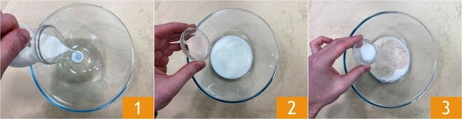 Pour préparer les khachapuri, commencez par verser dans un bol le lait tiède 1 et la levure déshydratée 2. Ajoutez le sucre pour l'activer 3 et mélangez.
