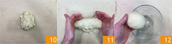 Transférez sur un plan de travail 10 et travaillez le mélange avec un peu de farine jusqu'à ce qu'il soit lisse 11. Transférez-le ensuite dans un grand bol 12.