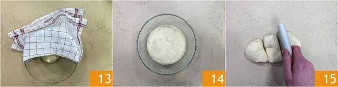 Couvrez et laissez lever environ 2 heures dans un endroit tiède 13. Quand la pâte aura bien levé 14, transférez-la sur un plan de travail et divisez-la en 3 portions égales 15.