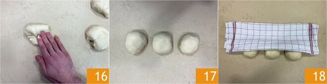 Prenez la première portion et formez une boule 16, faites de même avec les autres 17 et couvrez-les avec un torchon 18.