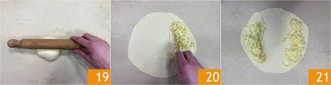 Étalez-en une pour former un disque 19. Disposez le provolone râpé sur un des côtés 21 puis aussi sur l'autre 21.