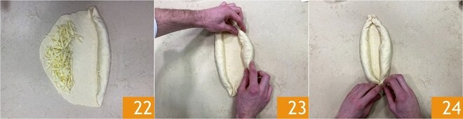 Repliez les bords en roulant le fromage à l'intérieur 22 23, puis pincez les extrémités 24.