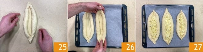 Vous devrez former une barquette 25. Disposez les barquettes sur une plaque avec du papier sulfurisé 26 et remplissez l'intérieur avec beaucoup de fromage 27.