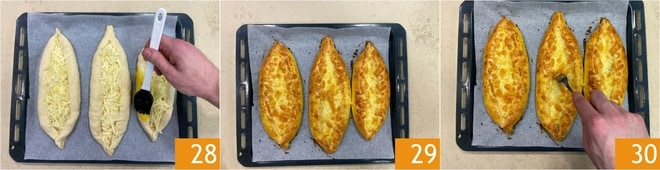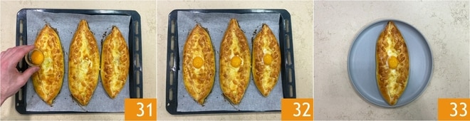 Placez à l'intérieur un jaune d'œuf 31 et faites cuire à nouveau au four pendant 3 minutes. Sortez-les du four 32 et servez vos khachapuri encore chauds 33 !