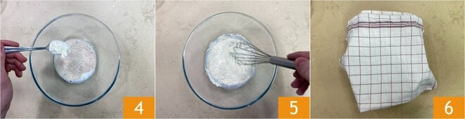 Ajoutez 2 cuillères à soupe de farine 4 et mélangez avec un fouet 5, puis couvrez avec un torchon 6. Laissez reposer pendant 5 minutes.