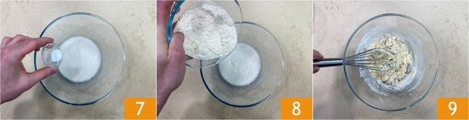 Ajoutez ensuite le sel 7 et le reste de la farine 8. Mélangez encore avec le fouet 9 jusqu'à obtenir un mélange homogène.