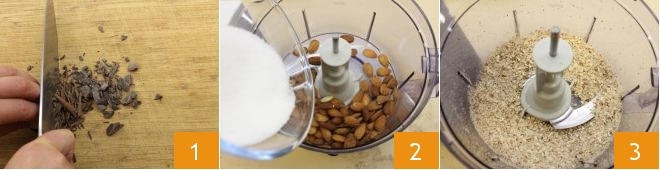 Pour réaliser les kipferl au chocolat, hachez le chocolat noir 1 mettez les amandes dans le mixeur avec la moitié du sucre 2 et hachez-les pas trop finement pour obtenir le grain classique 3,