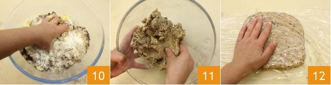 Pétrissez rapidement les ingrédients à la main 10 jusqu'à obtenir une pâte homogène et compacte 11, formez une boule, enveloppez-la de film plastique 12 et laissez-la reposer au réfrigérateur pendant 2 heures.