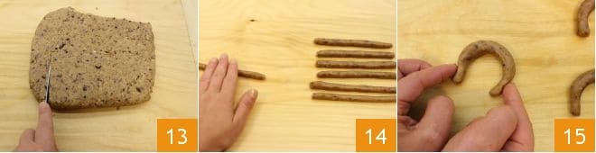 Après le temps de repos, prenez la pâte, divisez-la en morceaux d'environ 15 g chacun 13, roulez les morceaux pour créer des bâtonnets de ½ cm d'épaisseur et d'environ 10 cm de long 14, repliez les bâtonnets pour former des fers à cheval 15, avec ces doses, vous obtiendrez environ 50 biscuits.