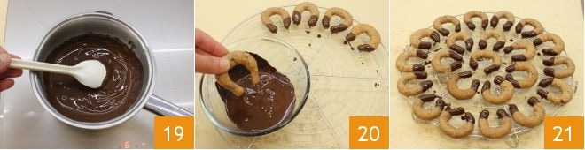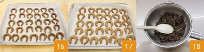 Disposez les biscuits sur une plaque recouverte de papier sulfurisé 16 et laissez-les reposer encore 30 minutes au réfrigérateur. Après le temps de repos, faites cuire les kipferl dans un four statique préchauffé à 170° pendant 20 minutes (ou four ventilé à 150° pendant 15 minutes). Une fois la cuisson terminée, sortez les biscuits du four 17 et laissez-les refroidir sur une grille. Pendant ce temps, mettez le chocolat haché dans une casserole au bain-marie 18,