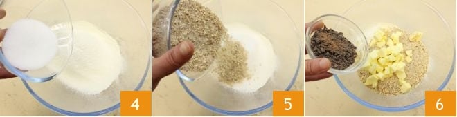 Dans un bol, tamisez la farine, incorporez l'autre moitié du sucre semoule 4, ajoutez le grain d'amandes 5. Puis ajoutez le beurre froid en morceaux et le chocolat haché 6.