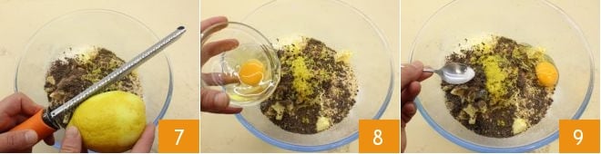 Aromatisez avec le zeste de citron râpé 7 et ajoutez également l'œuf 8 et la pincée de sel 9.