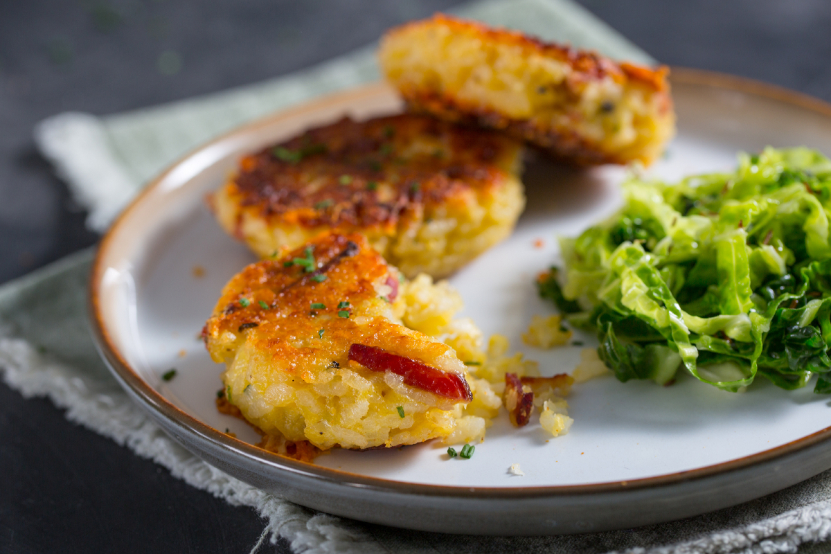 Une fois rissolées d'un côté, retournez-les de l'autre 16 17. Dressez les canederli de riz accompagnés de chou finement coupé et assaisonné avec de l'huile, du vinaigre, du sel, du poivre et du cumin 18 ! Vous pouvez aromatiser avec plus de ciboulette à votre goût.