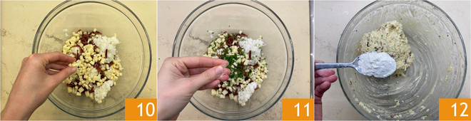 Assaisonnez avec une pincée de sel 10, de la ciboulette et du poivre 11. Mélangez, puis ajoutez la farine (vous pouvez ajuster la consistance en ajoutant progressivement pour voir s'il faut toute la quantité indiquée) 12.