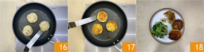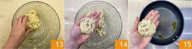 Pétrissez jusqu'à obtenir une pâte compacte 13. Formez des galettes d'environ 90 g chacune 14 et faites-les rissoler dans une poêle antiadhésive avec un filet d'huile à feu moyen 15.