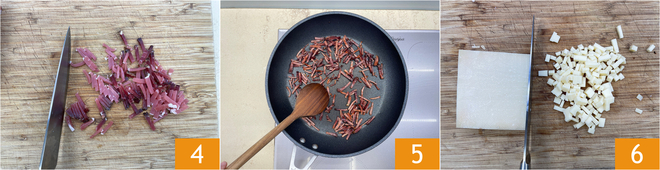 Entre-temps, coupez le speck en petits morceaux fins 4 et faites-le rissoler dans une poêle antiadhésive sans ajouter de matières grasses 5. Coupez également le fromage en petits cubes très petits 6.
