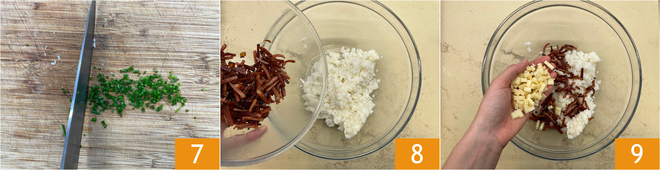 Ciselez finement la ciboulette 7. À ce stade, il est temps de pétrir : dans un bol, mélangez le riz, le speck 8, le fromage 9 et les œufs.