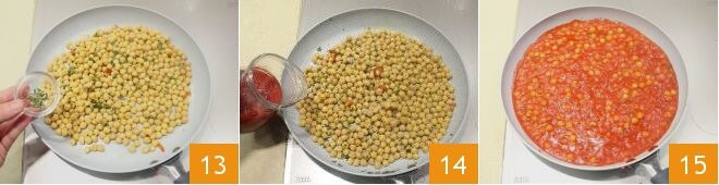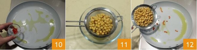 puis retirez l'ail et ajoutez le piment frais haché 10; faites-le revenir et entre-temps égouttez les pois chiches maintenant cuits 11. Ajoutez-les dans la poêle 12