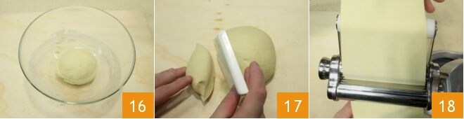 Entre-temps, reprenez la pâte 16, divisez-la en morceaux 17 et passez-les dans la machine à pâtes, en réglant progressivement l'épaisseur jusqu'à atteindre 2 mm (vous pouvez également étaler la pâte avec un rouleau à pâtisserie) 18.