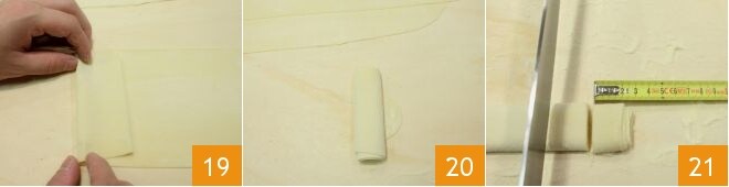Vous devez obtenir une bande de pâte fine à enrouler sur elle-même (19-20). Coupez chaque rouleau de pâte en morceaux de 2 cm d'épaisseur 21,