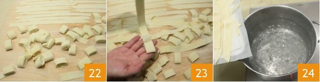 et continuez de la même manière jusqu'à épuisement de toute la pâte 22; vous pouvez ensuite étaler les lagane à la main 23 et les disposer sur un plateau légèrement fariné couvert d'un torchon propre; laissez reposer 15-20 minutes. Ensuite, portez à ébullition de l'eau salée dans une grande casserole et faites cuire les lagane pendant quelques secondes 24
