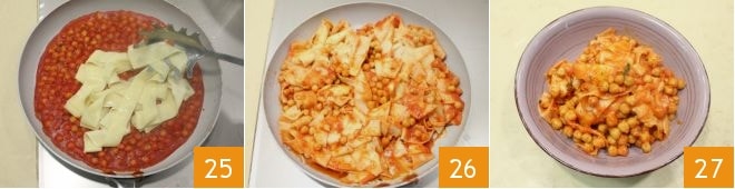 puis égouttez les pâtes à l'aide d'une écumoire et transférez-les dans la poêle avec les pois chiches 28; mélangez quelques instants 26, puis laissez reposer une minute avant de servir les lagane aux pois chiches bien chaudes 27!