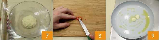 Faites une boule de pâte, couvrez-la de film plastique 7 et laissez reposer à température ambiante pendant au moins une demi-heure pour que la pâte se détende. Entre-temps, ôtez les graines du piment frais 8 et hachez-le, épluchez l'ail et divisez-le en deux; puis faites-le revenir dans une grande poêle avec l'huile 9
