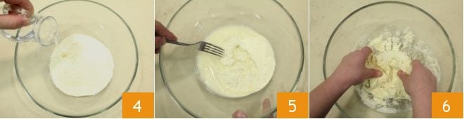 En attendant, consacrez-vous aux lagane : dans un bol, versez la semoule de blé dur et ajoutez l'eau à température ambiante en filet, petit à petit 4, en mélangeant avec une fourchette 5. Travaillez la pâte à la main directement dans le bol 6 jusqu'à obtenir une consistance lisse et homogène.
