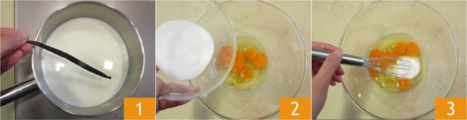 Pour préparer le lait à la portugaise, commencez par verser le lait dans une casserole et ajoutez la gousse de vanille que vous aurez préalablement fendue dans le sens de la longueur 1. Portez à frémissement à feu doux. Pendant ce temps, mettez les œufs, les jaunes et le sucre dans un grand bol 2 et mélangez le tout avec un fouet manuel 3.