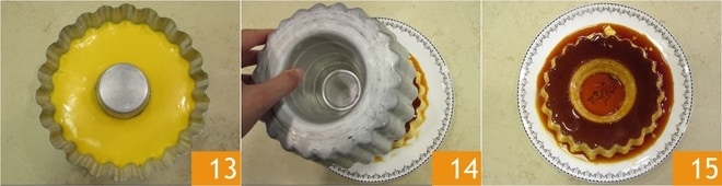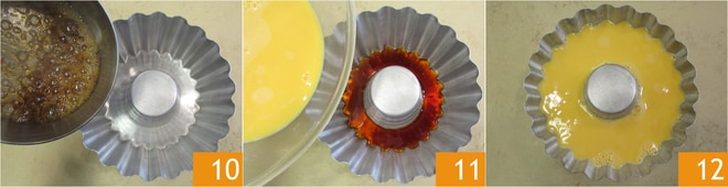 À ce stade, versez le caramel chaud dans un moule à savarin de diamètre supérieur de 20 cm, inférieur de 15 cm, et hauteur de 8 cm 10. Laissez-le refroidir pendant quelques minutes, puis ajoutez le mélange d'œufs 11. Placez le moule dans un plat à four aux bords hauts que vous remplirez de quelques centimètres d'eau et faites cuire au bain-marie dans un four statique préchauffé à 160°C pendant environ 75 minutes 12.