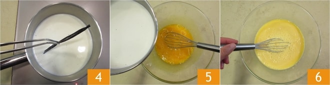 Lorsque le lait est chaud, retirez la gousse de vanille 4 et ajoutez-le au mélange d'œufs 5, en mélangeant bien avec le fouet 6. Mettez le mélange de côté et préparez le caramel.