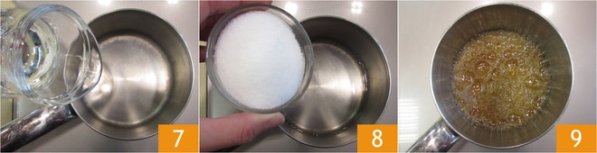 Versez l'eau dans une casserole 7, ajoutez le sucre 8 et mettez sur le feu à feu moyen jusqu'à obtenir une belle couleur ambrée 9.