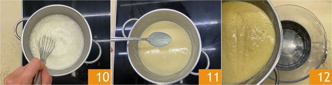 Une fois que tout le lait est incorporé, remettez le liquide dans la casserole et faites cuire à feu moyen-doux en mélangeant constamment, en alternant fouet 10 et spatule. Faites attention à ne pas faire coaguler le mélange et à ne pas former de grumeaux. Vous pouvez arrêter la cuisson lorsque le mélange est épaissi, fluide et qu'en immergeant une cuillère, il en ressortira comme recouvert et voilé 11. Maintenant, remplissez une casserole d'eau froide et de glace et placez à l'intérieur un bol vide, de préférence froid. Versez le mélange dans le bol 12 et mélangez pour le refroidir.