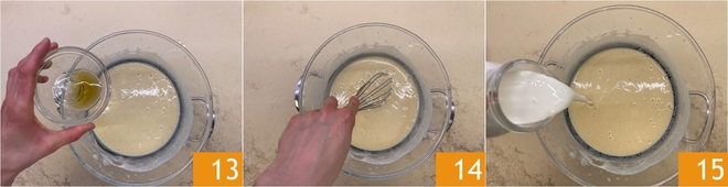 Ajoutez ensuite le brandy 13 et mélangez à nouveau 14. Ajoutez enfin la crème 15.