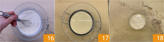 Mélangez doucement avec le fouet 16 sans incorporer trop d'air 17. Le lait de poule peut être servi froid, chaud ou tiède; vous pouvez ajouter une râpée de muscade sur chaque verre avant de le servir 18.