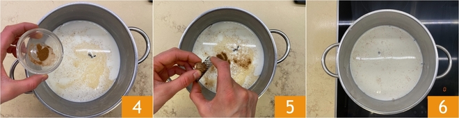 Pour préparer le lait de poule, versez le lait dans une casserole, puis aromatisez avec la vanille 1, le gingembre 2 et les clous de girofle 3.