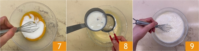Mélangez le sucre et les jaunes d'œufs avec un fouet 7 jusqu'à ce qu'ils deviennent clairs et mousseux (vous pouvez également utiliser des batteurs électriques pour plus de confort). Lorsque le lait est chaud, versez-le progressivement dans le mélange de jaunes, en le filtrant pour retirer les clous de girofle 8. Cette opération doit être effectuée calmement, en mélangeant bien chaque fois que vous ajoutez le lait 9, ainsi les œufs ne cuiront pas.