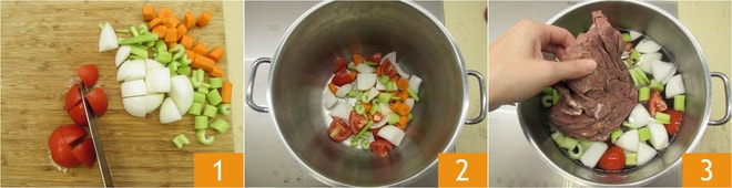 Épluchez l'oignon et coupez-le en gros morceaux, puis épluchez 2 carottes, enlevez les extrémités et coupez-les également en morceaux. Faites de même avec le céleri, puis divisez également la tomate en 4 parties 1. Dans une grande casserole haute, versez les légumes pour le bouillon 2, ajoutez 4 litres d'eau et allumez le feu, puis ajoutez le lampredotto 3.
