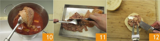 Pendant ce temps, le lampredotto sera prêt 10, transférez-le sur une plaque ou une planche en acier et coupez-le de manière à mélanger la partie la plus maigre avec la plus grasse 11. Répartissez un peu de lampredotto sur la base du petit pain 12.
