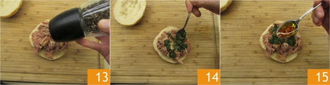 Assaisonnez avec une bonne pincée de sel, une râpée de poivre 13, une cuillère à café de sauce verte 14 et, si vous le souhaitez, un filet d'huile piquante 15.