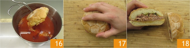 Vous pouvez tremper brièvement dans le bouillon la moitié supérieure du petit pain 16 avant de refermer 17 et de déguster votre sandwich au lampredotto 18 !