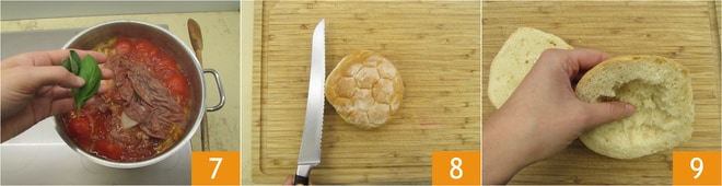 Ajoutez aussi les herbes (basilic, sauge, menthe) 7. Mélangez et laissez cuire pendant environ une heure, avec le couvercle. Il ne sera pas nécessaire d'écumer le bouillon. Après une heure, coupez chaque petit pain en deux 8, puis retirez une partie de la mie du couvercle 9.
